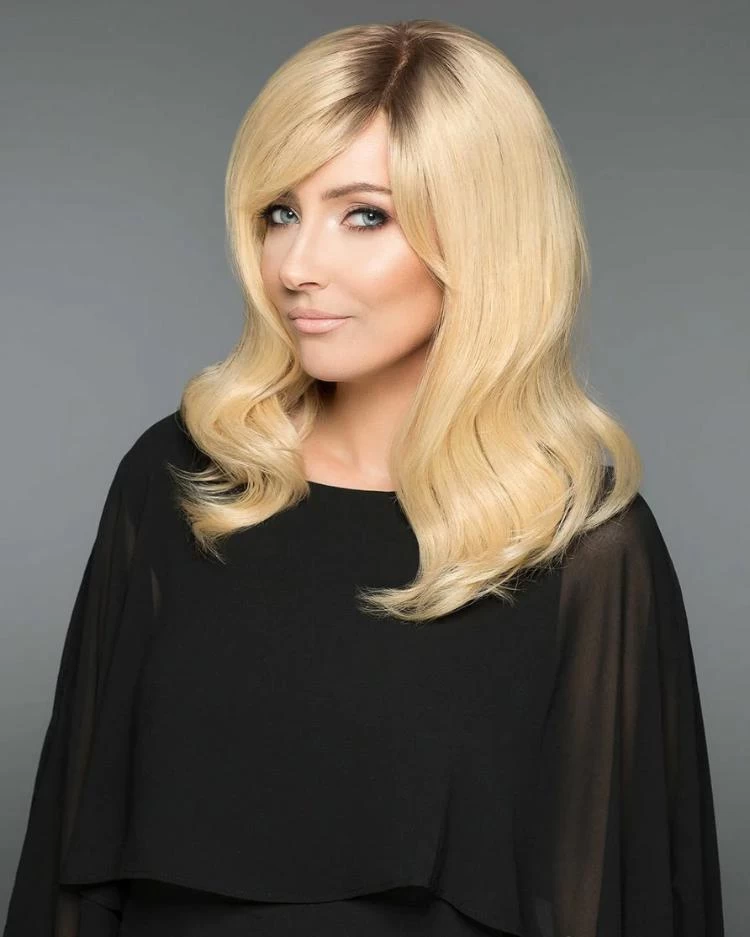 Adelle 100SL wig has long soft face framing style with parting and playful bangs for a versatile and modern look.