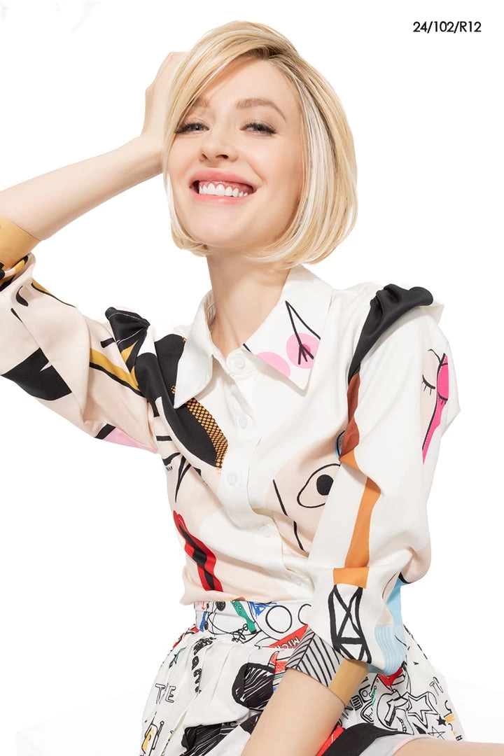 A trendy short asymmetric bob haircut that’s realistic, stylish, light and comfortable, full of energy, and ready to wear. Low-density chin-length layers with sweeping bangs that can brush in any direction and a bobbed back that slightly extends to the nape.
