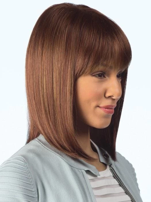 Tatum from our Amore Collection is a mid-length synthetic wig. This straight ready-to-wear wig is a fashion-forward look with a center part and a blunt fringe.
